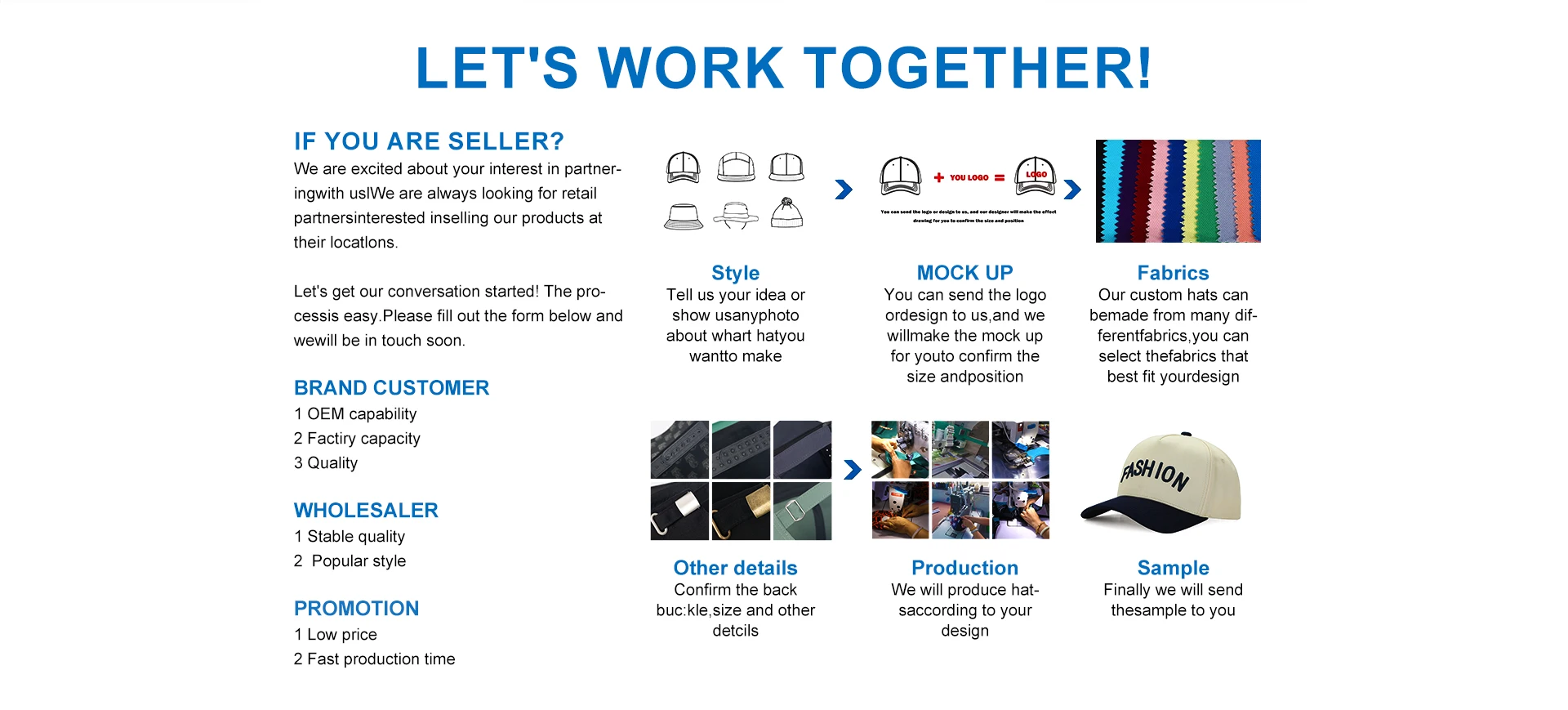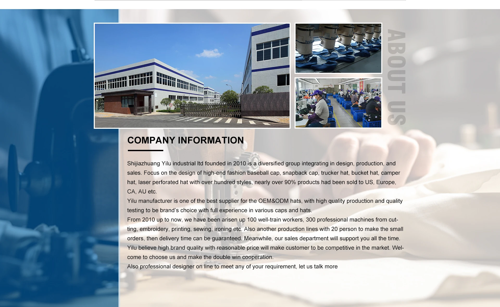 ผลิตภัณฑ์หลัก:หมวกเบสบอล, หมวกพ่อ, หมวก trucker, หมวก Snapback, หมวกฤดูหนาว